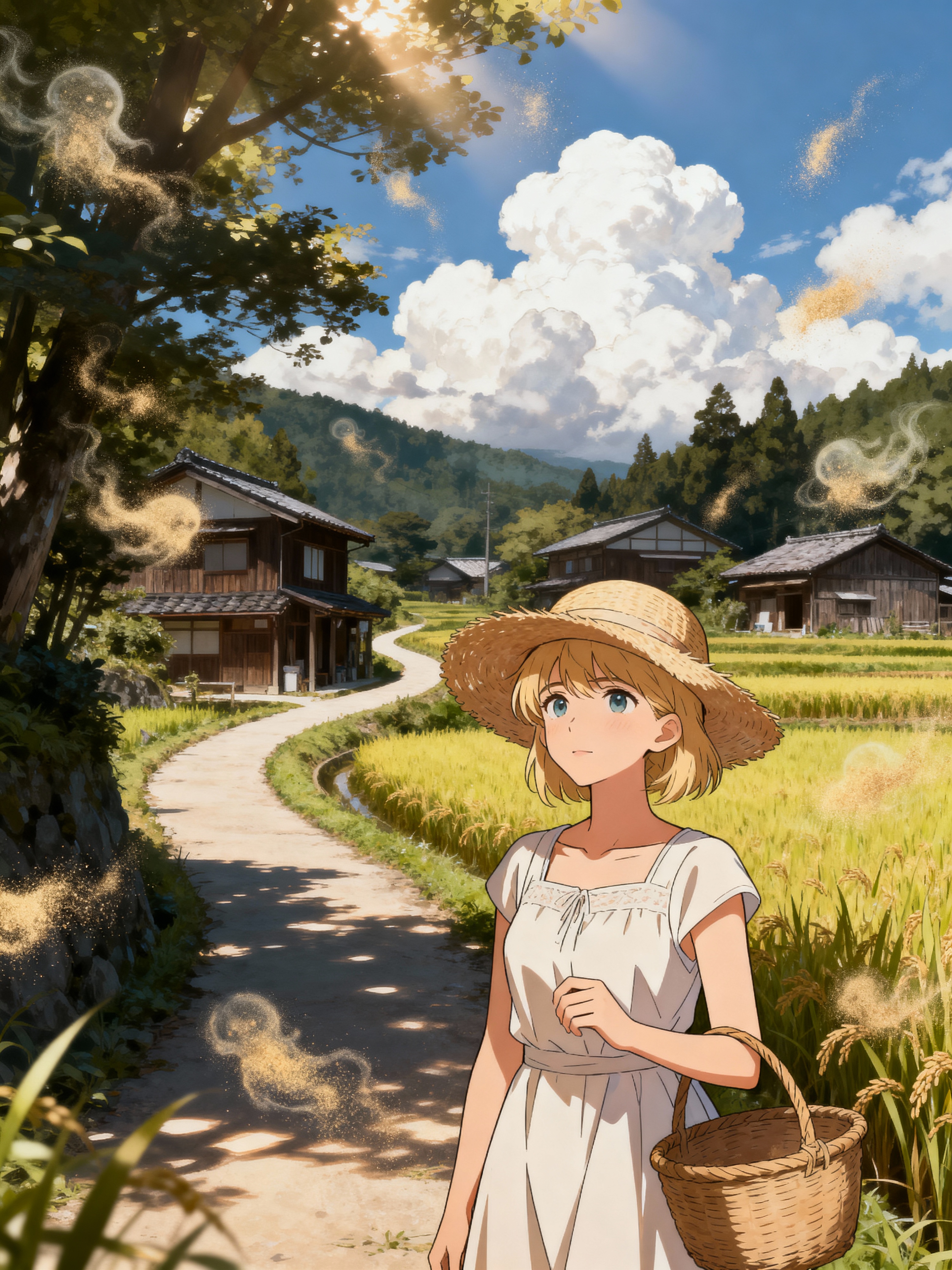A serene line art anime scene in a Japanese countryside. The path winds between traditional wooden houses and rice fields, with fluffy white clouds drifting overhead. Magical dust spirits dance in the warm sunlight that filters through the trees. In the foreground, model as a gentle character stands thoughtfully, wearing a simple summer dress with a straw hat and carrying a basket . The character has a kind expression, watching the spirits play. The scene captures the peaceful magic of everyday life, painted in soft, warm colors.