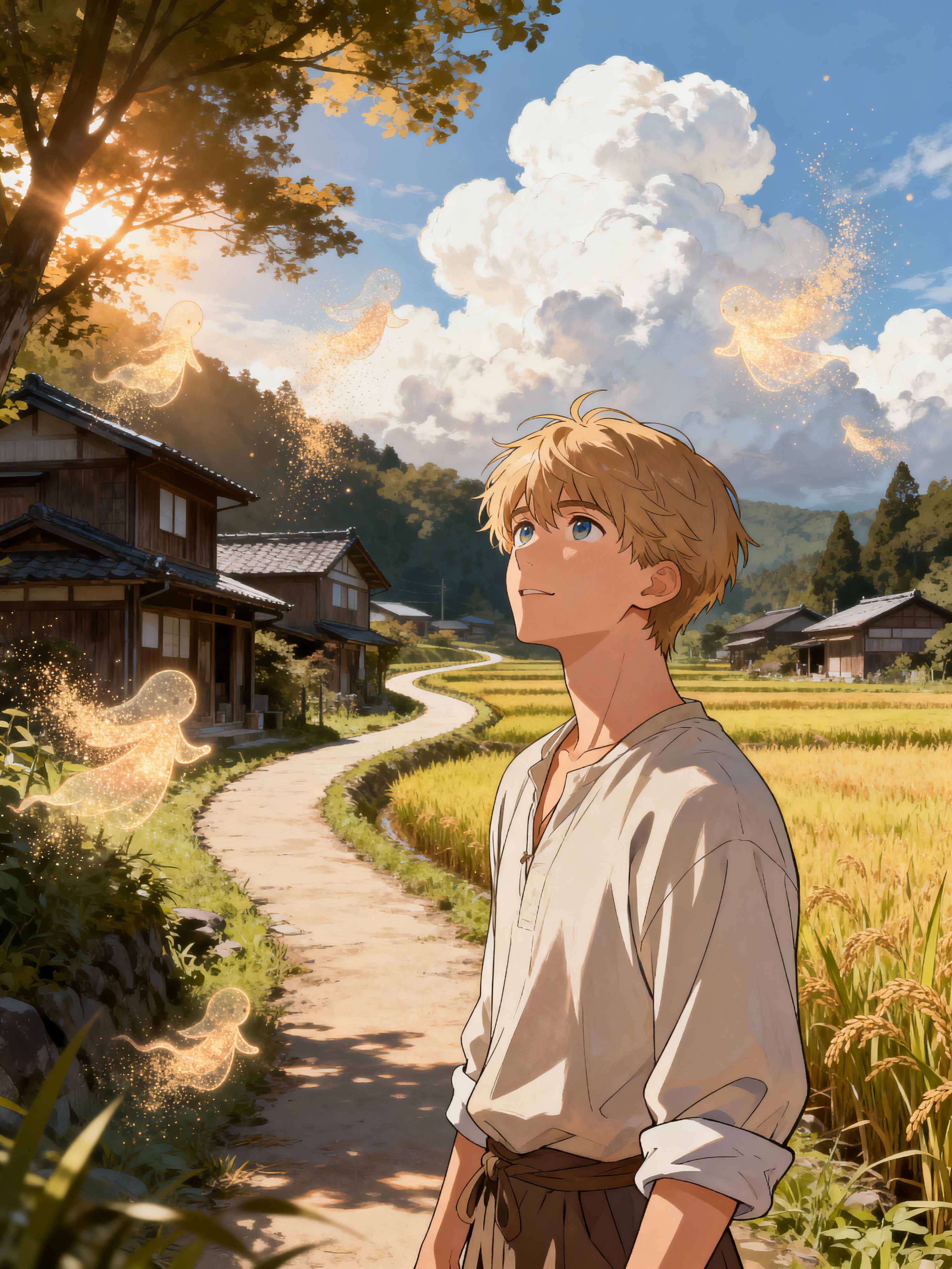 A serene line art anime scene in a Japanese countryside. The path winds between traditional wooden houses and rice fields, with fluffy white clouds drifting overhead. Magical dust spirits dance in the warm sunlight that filters through the trees. In the foreground, model as a gentle character stands thoughtfully, wearing light countryside clothes with rolled-up sleeves. The character has a kind expression, watching the spirits play. The scene captures the peaceful magic of everyday life, painted in soft, warm colors.