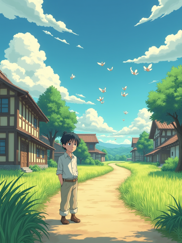 A serene line art anime-style anime scene in a Japanese countryside. The path winds between traditional wooden houses and rice fields, with fluffy white clouds drifting overhead. Magical dust spirits dance in the warm sunlight that filters through the trees. In the foreground, a gentle character stands thoughtfully, wearing light countryside clothes with rolled-up sleeves. The character has a kind expression, watching the spirits play. The scene captures the peaceful magic of everyday life, painted in soft, warm colors typical of Studio line art anime.