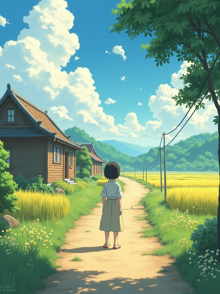 A serene line art anime-style anime scene in a Japanese countryside. The path winds between traditional wooden houses and rice fields, with fluffy white clouds drifting overhead. Magical dust spirits dance in the warm sunlight that filters through the trees. In the foreground, a gentle character stands thoughtfully, wearing light countryside clothes with rolled-up sleeves. The character has a kind expression, watching the spirits play. The scene captures the peaceful magic of everyday life, painted in soft, warm colors typical of Studio line art anime.