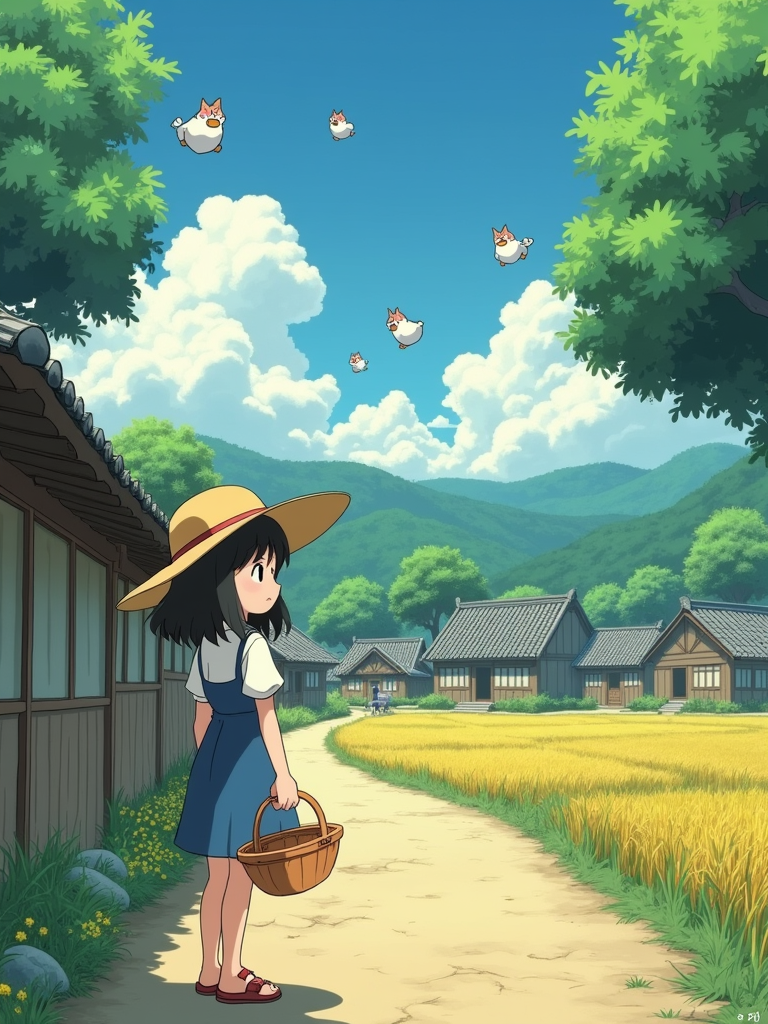 A serene line art anime-style anime scene in a Japanese countryside. The path winds between traditional wooden houses and rice fields, with fluffy white clouds drifting overhead. Magical dust spirits dance in the warm sunlight that filters through the trees. In the foreground, a gentle character stands thoughtfully, wearing a simple summer dress with a straw hat and carrying a basket . The character has a kind expression, watching the spirits play. The scene captures the peaceful magic of everyday life, painted in soft, warm colors typical of Studio line art anime.