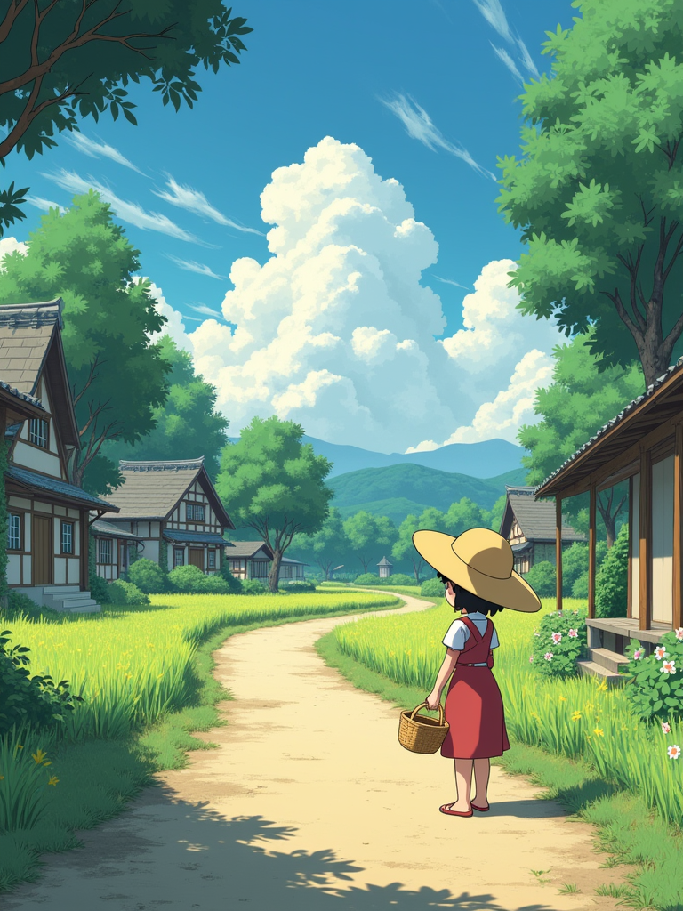 A serene line art anime-style anime scene in a Japanese countryside. The path winds between traditional wooden houses and rice fields, with fluffy white clouds drifting overhead. Magical dust spirits dance in the warm sunlight that filters through the trees. In the foreground, a gentle character stands thoughtfully, wearing a simple summer dress with a straw hat and carrying a basket . The character has a kind expression, watching the spirits play. The scene captures the peaceful magic of everyday life, painted in soft, warm colors typical of Studio line art anime.