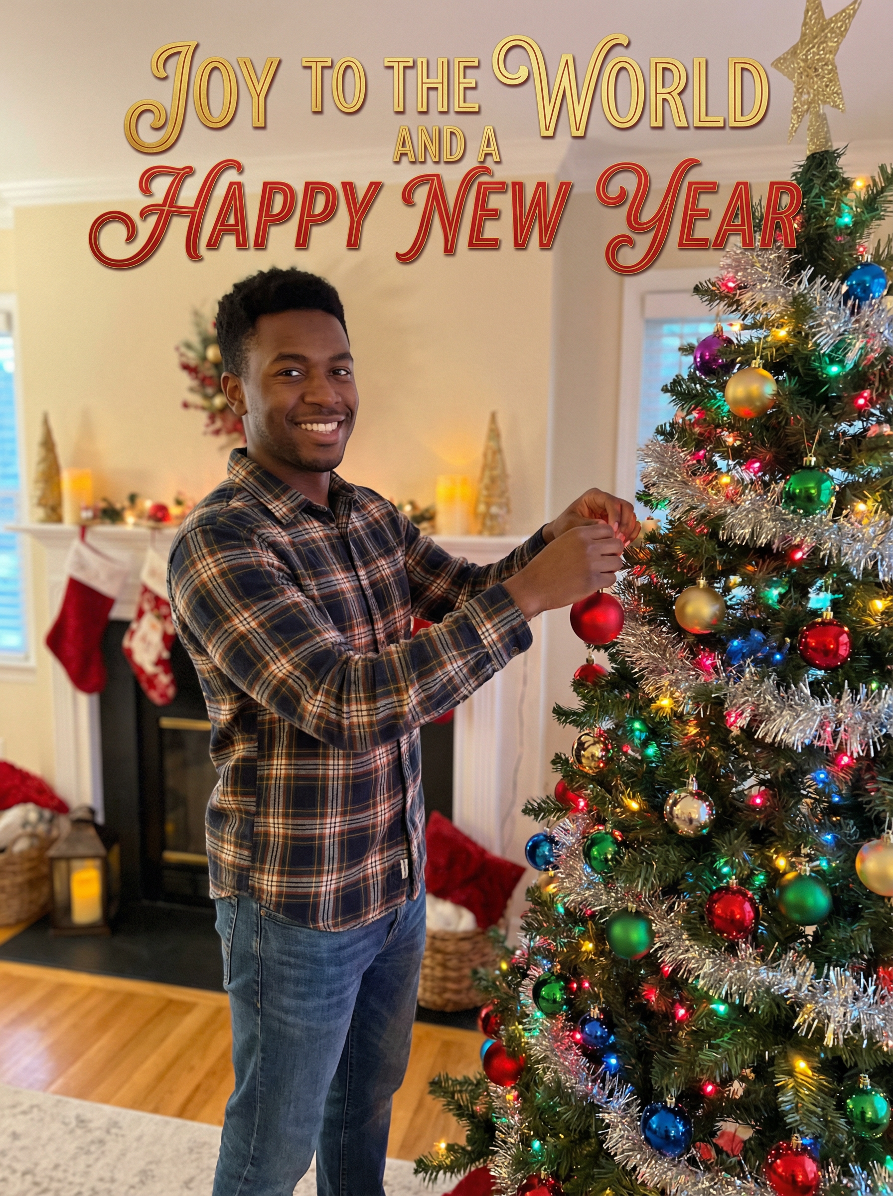 A smiling model decorating a Christmas tree with colorful ornaments and tinsel, in a warm, festive setting, with "Joy to the World and a Happy New Year" text overlayed on top of the photo in festive letters.