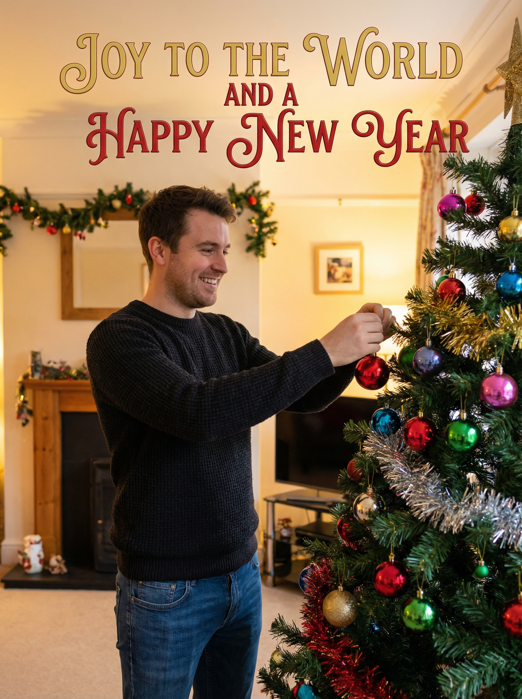 A smiling model decorating a Christmas tree with colorful ornaments and tinsel, in a warm, festive setting, with "Joy to the World and a Happy New Year" text overlayed on top of the photo in festive letters.
