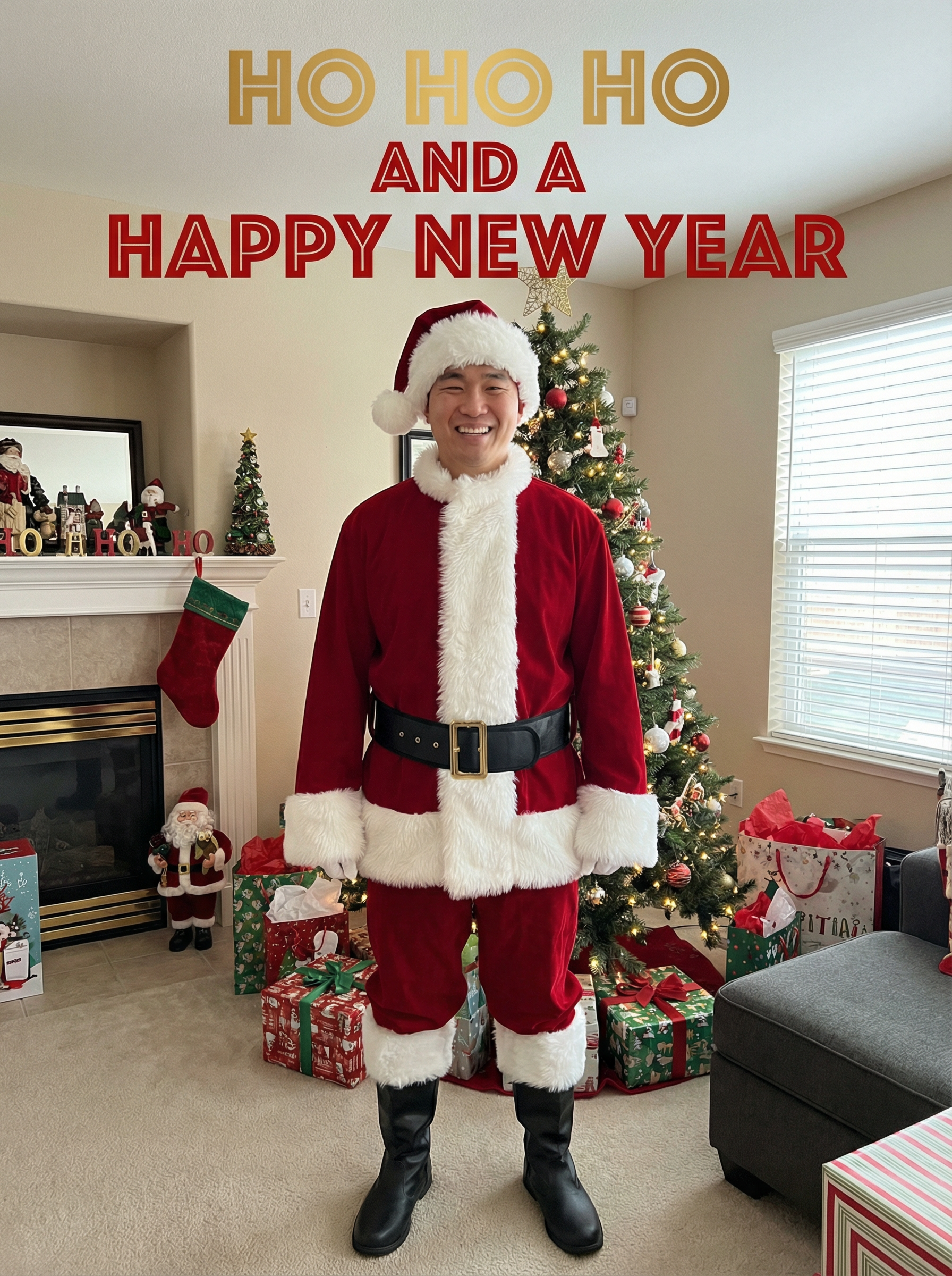 A smiling model dressed in a classic Santa costume, standing in a room filled with holiday decorations, presents, and a Christmas tree, with "Ho Ho Ho and a Happy New Year" text overlayed on top of the photo in festive letters.
