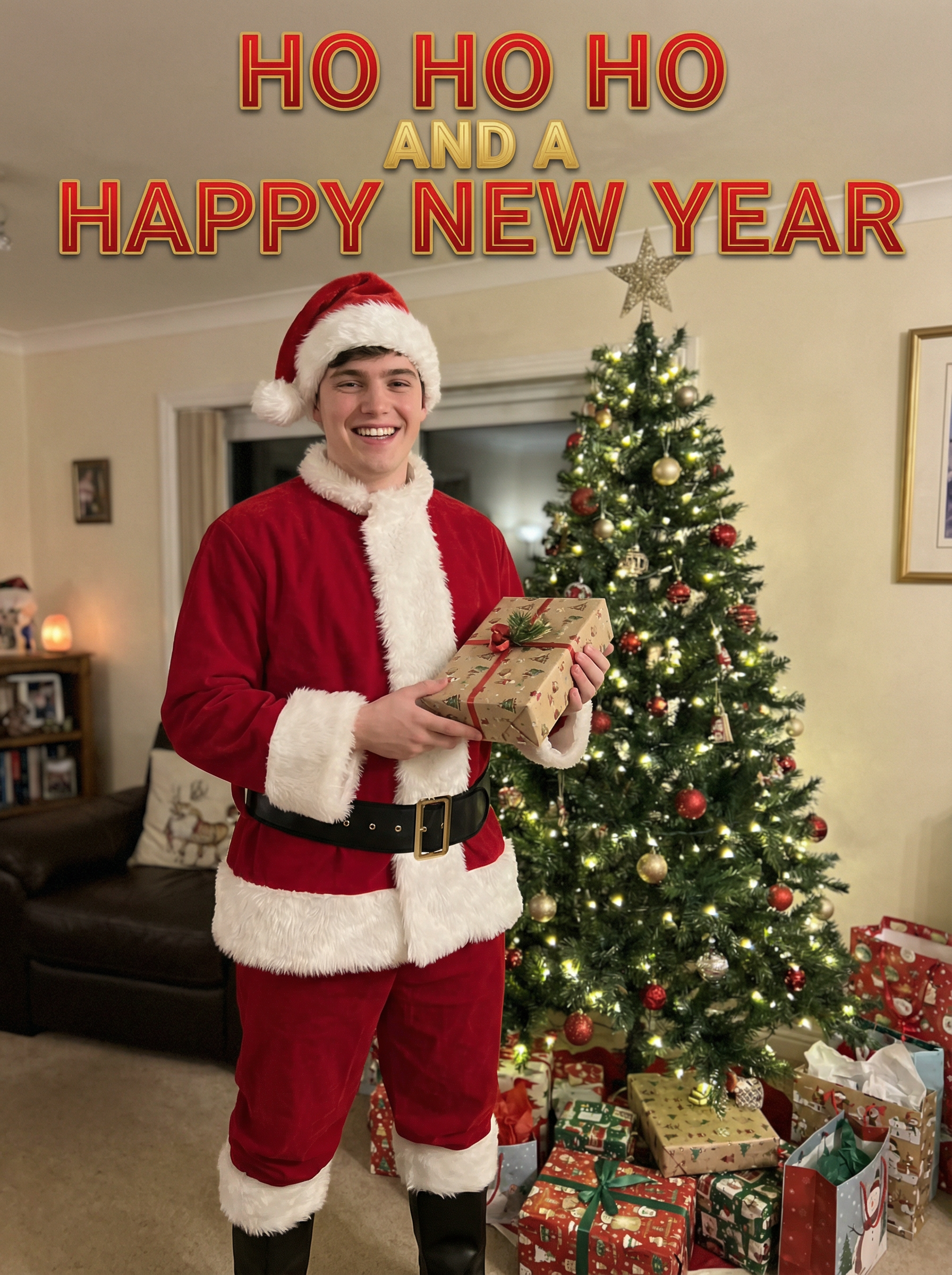 A smiling model dressed in a classic Santa costume, standing in a room filled with holiday decorations, presents, and a Christmas tree, with "Ho Ho Ho and a Happy New Year" text overlayed on top of the photo in festive letters.