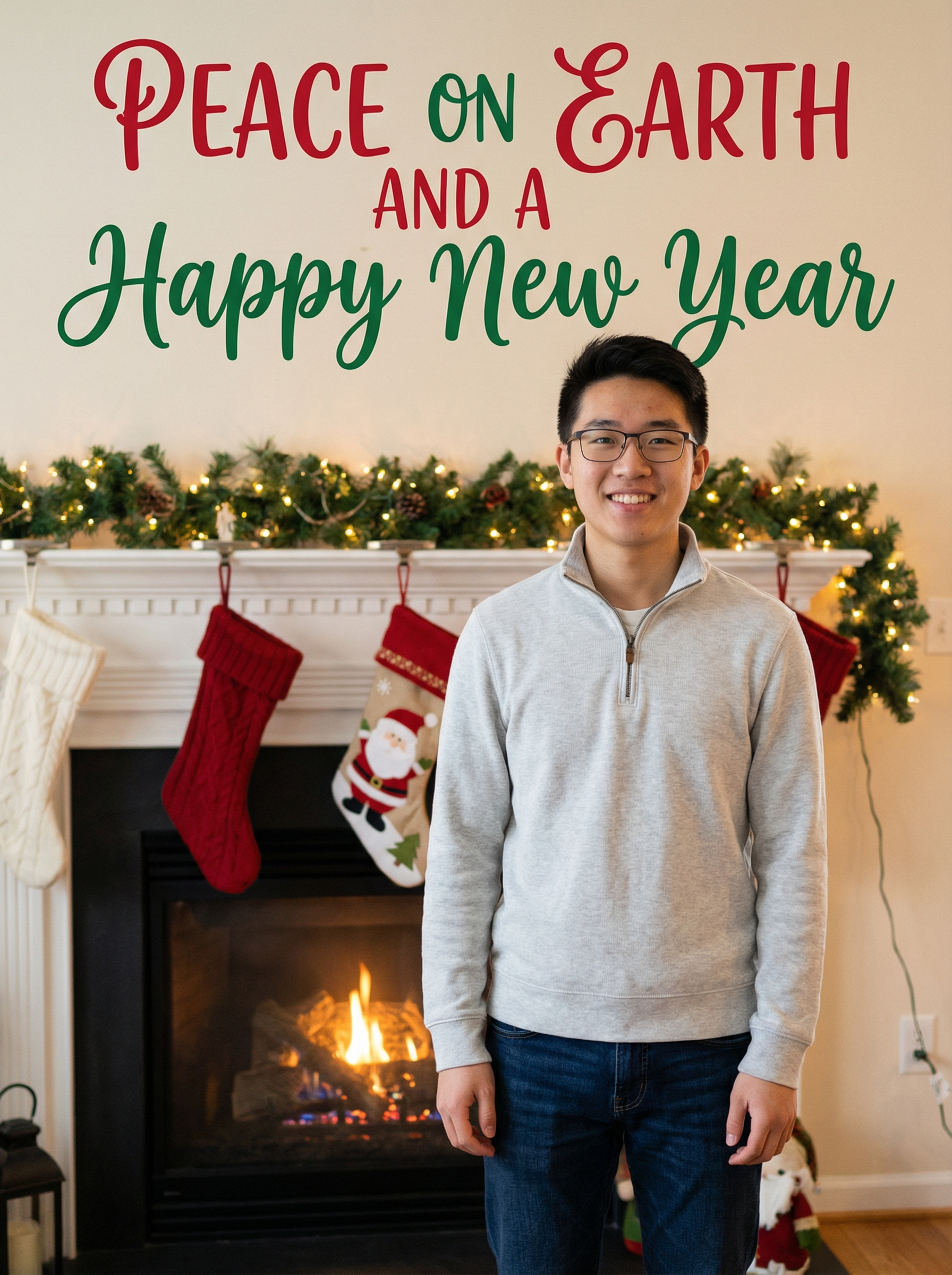 A smiling model posing for a Christmas card photo, standing in front of a fireplace with stockings, garland, and holiday decorations, with "Peace on Earth and a Happy New Year" text overlayed on top of the photo in festive letters.