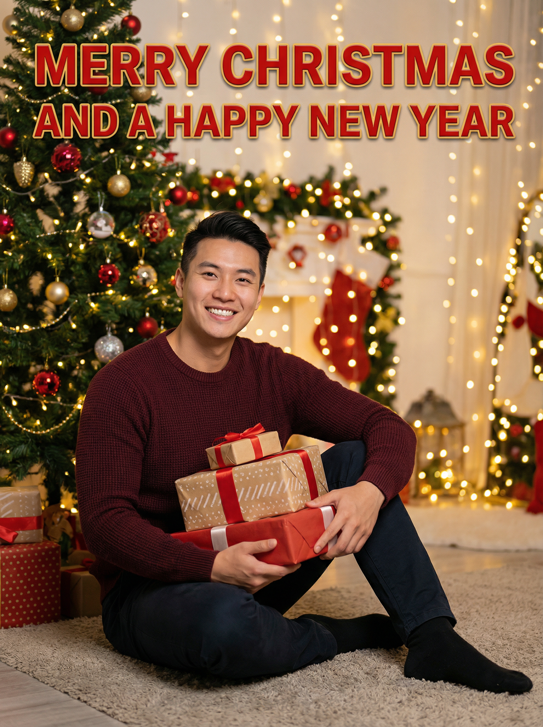 A smiling model sitting by a decorated Christmas tree, holding gifts with festive lights and ornaments in the background, with "Merry Christmas and a Happy New Year" text overlayed on top of the photo in festive letters.