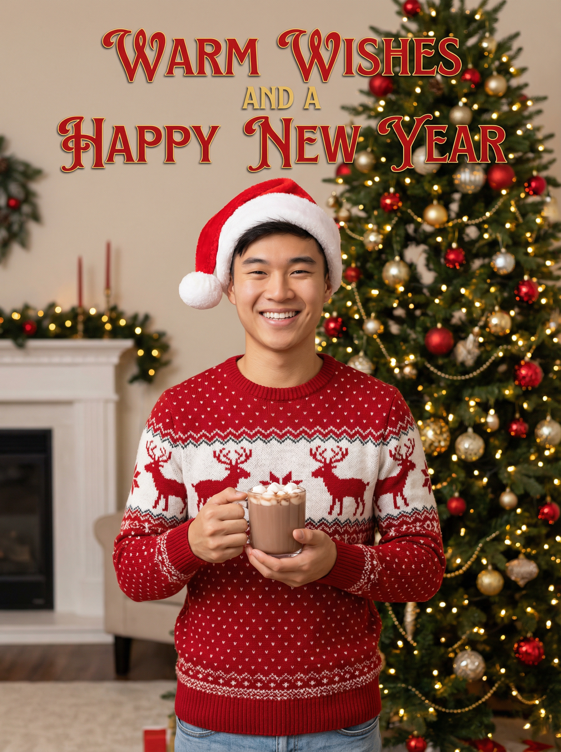 A smiling model wearing Christmas sweaters and Santa hats, enjoying hot cocoa in front of a decorated Christmas tree, with "Warm Wishes and a Happy New Year" text overlayed on top of the photo in festive letters.