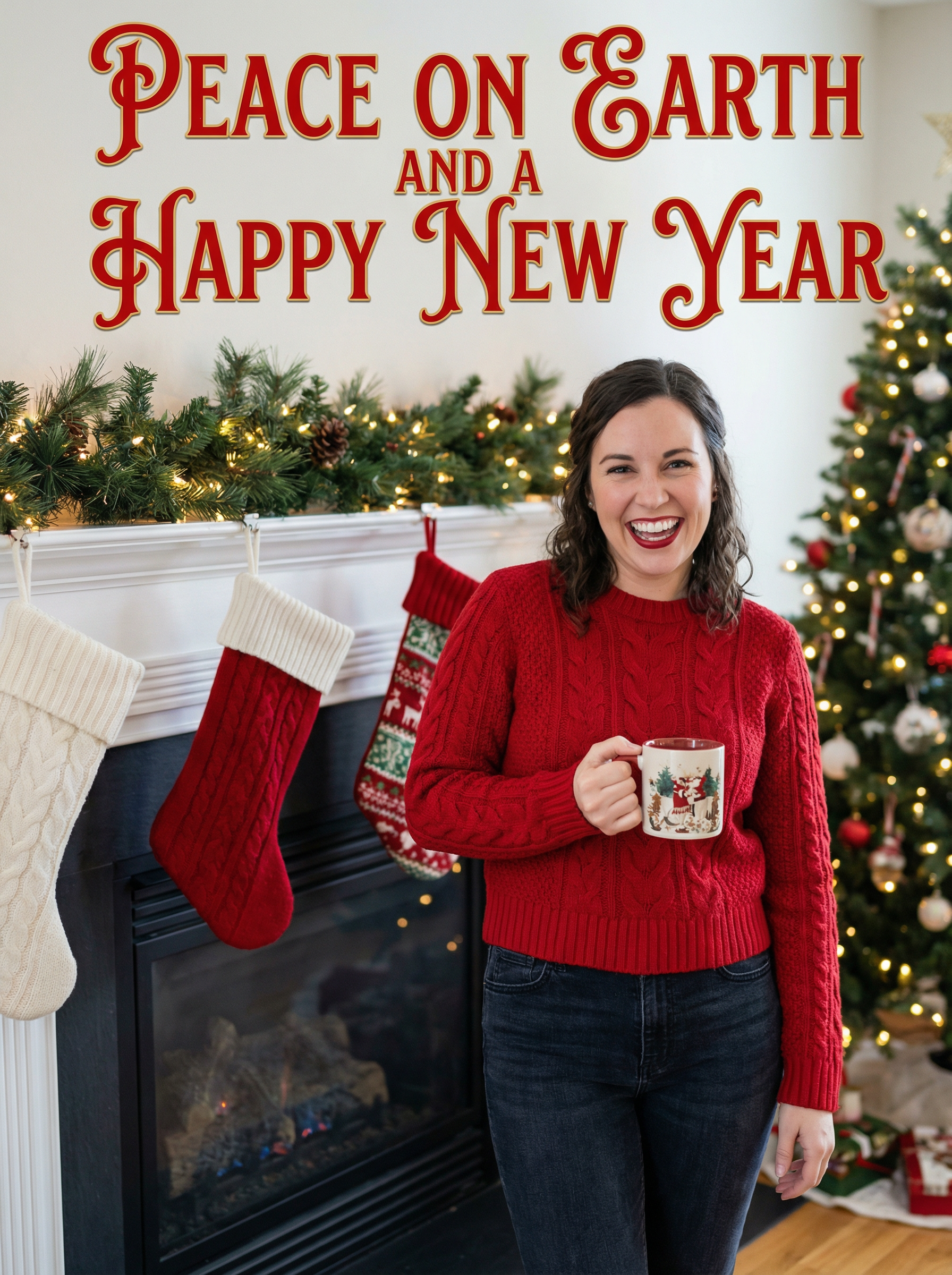 A smiling model posing for a Christmas card photo, standing in front of a fireplace with stockings, garland, and holiday decorations, with "Peace on Earth and a Happy New Year" text overlayed on top of the photo in festive letters.