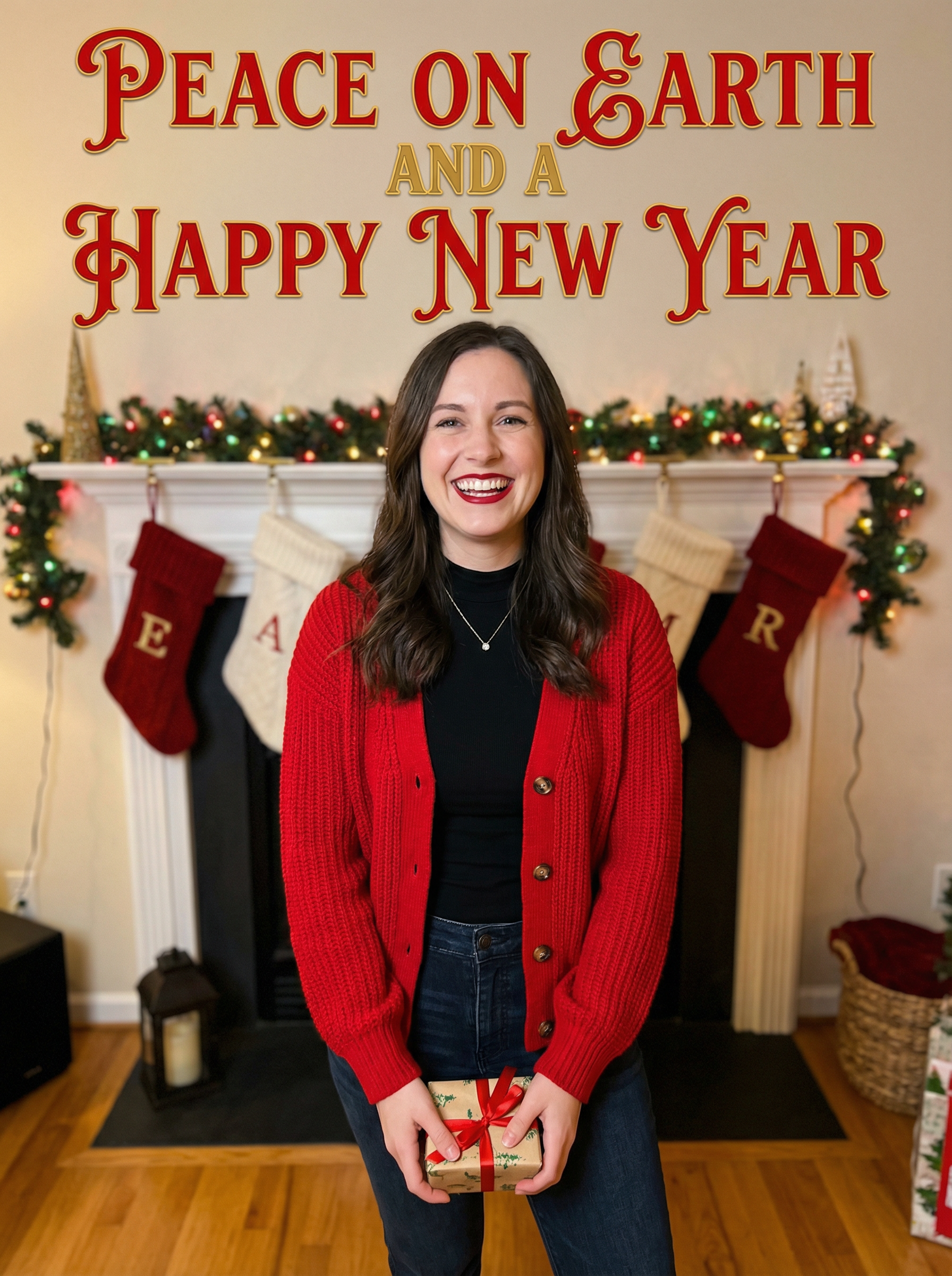 A smiling model posing for a Christmas card photo, standing in front of a fireplace with stockings, garland, and holiday decorations, with "Peace on Earth and a Happy New Year" text overlayed on top of the photo in festive letters.