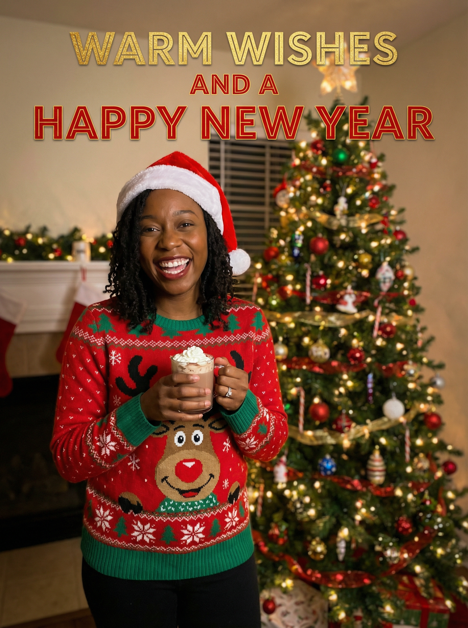 A smiling model wearing Christmas sweaters and Santa hats, enjoying hot cocoa in front of a decorated Christmas tree, with "Warm Wishes and a Happy New Year" text overlayed on top of the photo in festive letters.