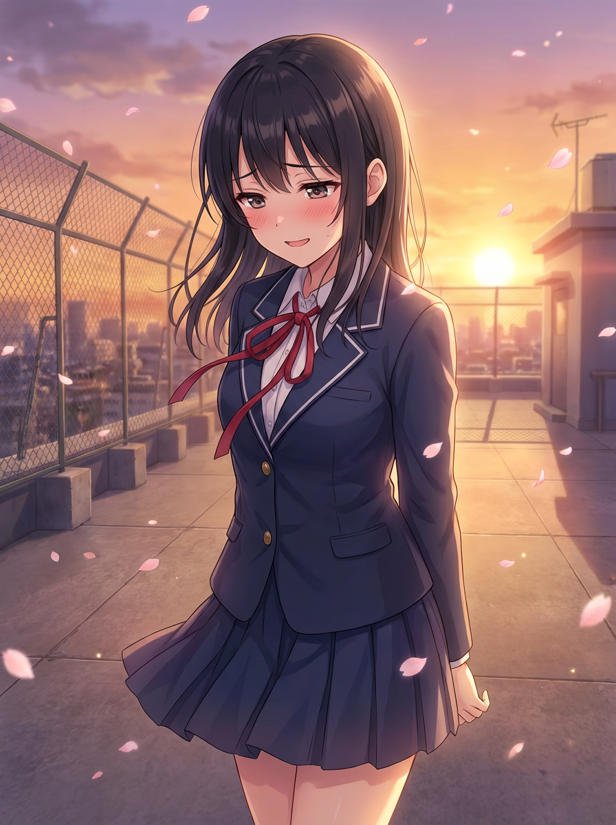 A soft, romantic anime-style scene set on a high school rooftop during sunset. The character wears a cute school uniform with a flowing ribbon and a bashful expression . Cherry blossoms are drifting in the air as the warm golden sunlight highlights the peaceful moment. The style is in anime illustration.