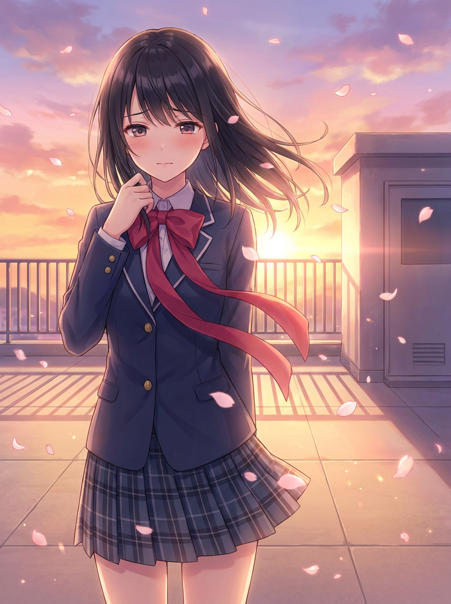 A soft, romantic anime-style scene set on a high school rooftop during sunset. The character wears a cute school uniform with a flowing ribbon and a bashful expression . Cherry blossoms are drifting in the air as the warm golden sunlight highlights the peaceful moment. The style is in anime illustration.