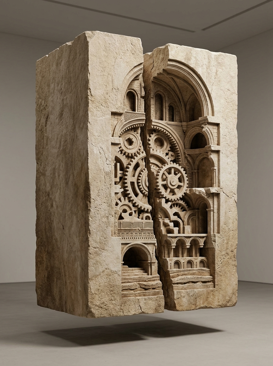 A solitary [OBJECT] floating in absolute stillness, split by a precise geological fault. Within the opening lies a meticulously constructed [Inner World / Mechanism], revealed like a museum cross-section. Every internal form is sculpted entirely from [Object Material], featuring [Iconic Details / Structural Elements] arranged with architectural logic. Layered strata, load-bearing forms, hollow chambers, and repeating micro-patterns create a believable internal system. Hyper-detailed 3D bas-relief blended with editorial poster aesthetics. Emphasis on material authenticity โ [Surface Grain, Micro-cracks, Patina, Aging] at macro scale. Limited tonal palette derived from [Material Tones]. Exterior surface remains pristine and untouched. Neutral background, gallery lighting, ultra-sharp realism.