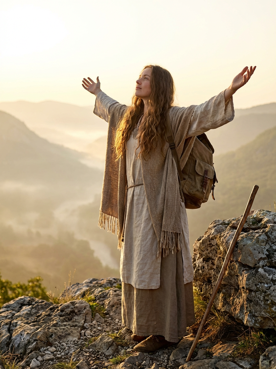 a spiritual seeker model standing with outstretched armsat sunrise