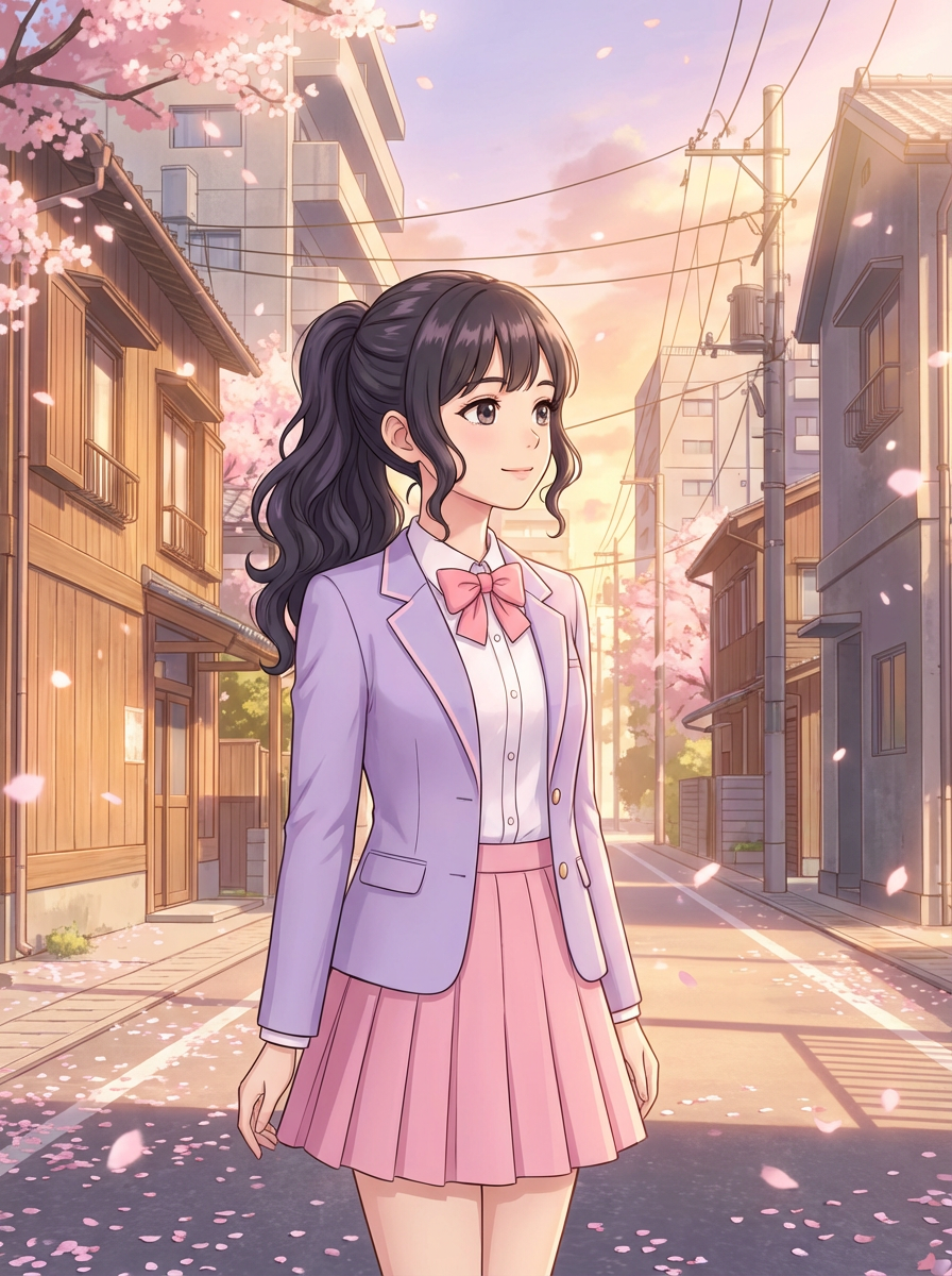 A stunning anime-style illustration of a peaceful Japanese street during cherry blossom season. The street is lined with traditional wooden houses and modern city buildings, with delicate pink sakura petals gently falling from the trees. Above, telephone poles and power lines crisscross the sky, adding a nostalgic urban touch. The golden-hour sunlight bathes the scene in warm hues, casting long shadows on the pavement. In the foreground, a stylish anime character poses confidently, wearing a cute pastel-colored school uniform with a flowing skirt and soft wavy hair . The character gazes softly into the distance, with an air of tranquility and wonder. The background captures the essence of a serene Tokyo suburb, with a soft bokeh effect adding a dreamy aesthetic. Highly detailed anime-style rendering with vibrant colors, cinematic lighting, and a magical atmosphere