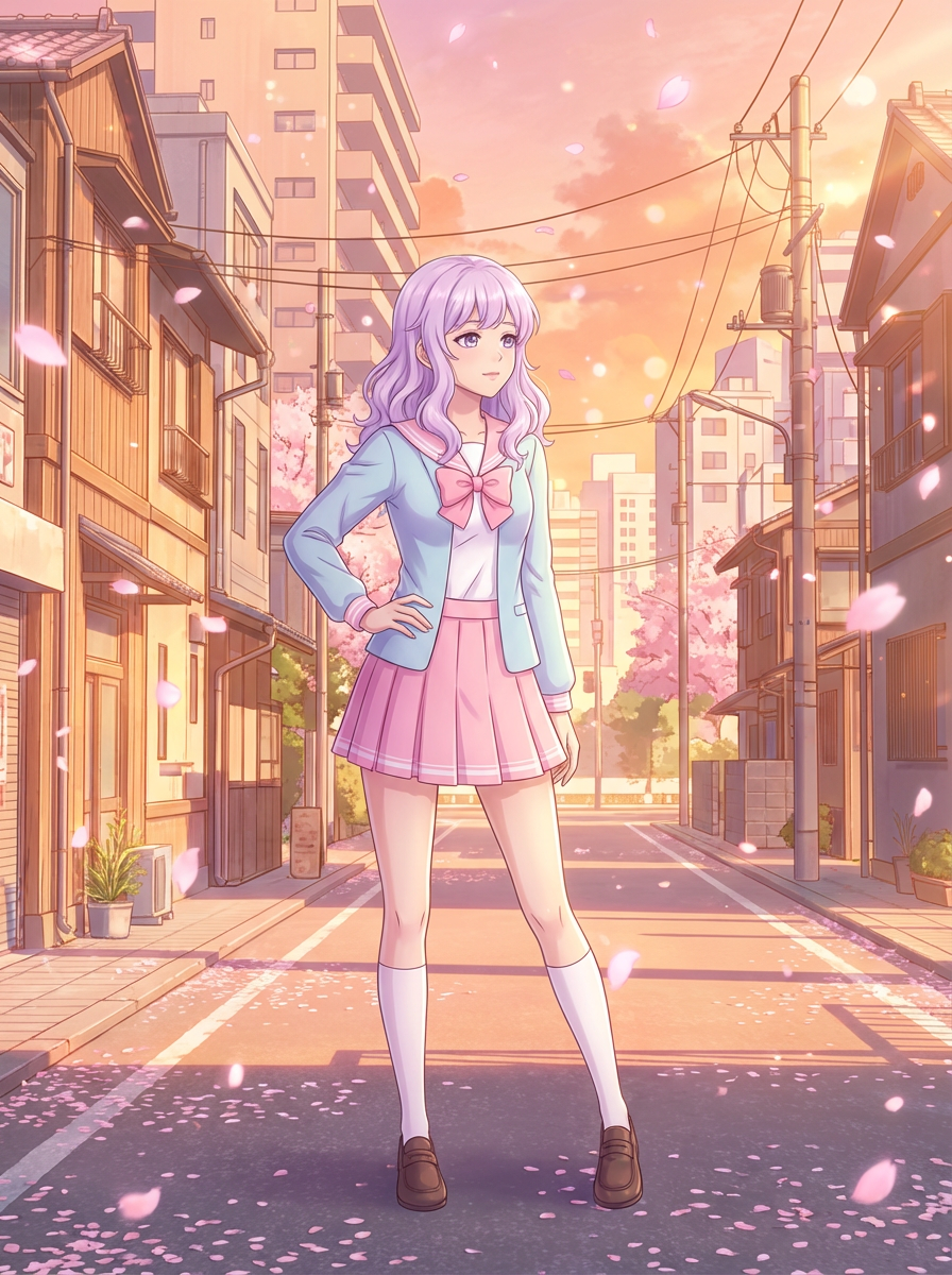 A stunning anime-style illustration of a peaceful Japanese street during cherry blossom season. The street is lined with traditional wooden houses and modern city buildings, with delicate pink sakura petals gently falling from the trees. Above, telephone poles and power lines crisscross the sky, adding a nostalgic urban touch. The golden-hour sunlight bathes the scene in warm hues, casting long shadows on the pavement. In the foreground, a stylish anime character poses confidently, wearing a cute pastel-colored school uniform with a flowing skirt and soft wavy hair . The character gazes softly into the distance, with an air of tranquility and wonder. The background captures the essence of a serene Tokyo suburb, with a soft bokeh effect adding a dreamy aesthetic. Highly detailed anime-style rendering with vibrant colors, cinematic lighting, and a magical atmosphere