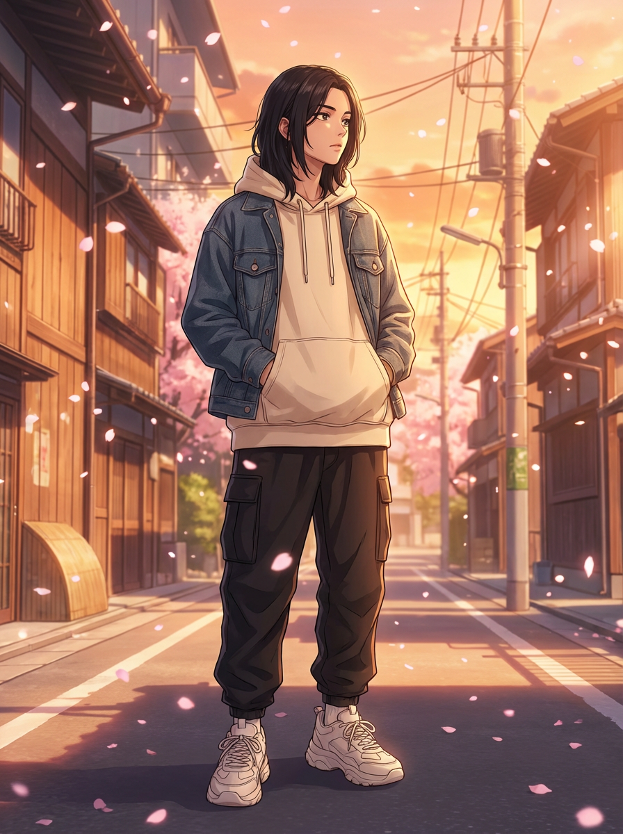 A stunning anime-style illustration of a peaceful Japanese street during cherry blossom season. The street is lined with traditional wooden houses and modern city buildings, with delicate pink sakura petals gently falling from the trees. Above, telephone poles and power lines crisscross the sky, adding a nostalgic urban touch. The golden-hour sunlight bathes the scene in warm hues, casting long shadows on the pavement. In the foreground, a stylish anime character poses confidently, wearing a casual yet stylish Japanese streetwear outfit, with a loose hoodie and sneakers. The character gazes softly into the distance, with an air of tranquility and wonder. The background captures the essence of a serene Tokyo suburb, with a soft bokeh effect adding a dreamy aesthetic. Highly detailed anime-style rendering with vibrant colors, cinematic lighting, and a magical atmosphere
