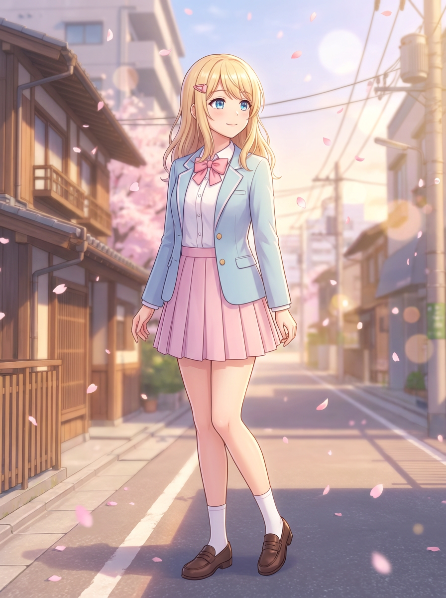 A stunning anime-style illustration of a peaceful Japanese street during cherry blossom season. The street is lined with traditional wooden houses and modern city buildings, with delicate pink sakura petals gently falling from the trees. Above, telephone poles and power lines crisscross the sky, adding a nostalgic urban touch. The golden-hour sunlight bathes the scene in warm hues, casting long shadows on the pavement. In the foreground, a stylish anime character poses confidently, wearing a cute pastel-colored school uniform with a flowing skirt and soft wavy hair . The character gazes softly into the distance, with an air of tranquility and wonder. The background captures the essence of a serene Tokyo suburb, with a soft bokeh effect adding a dreamy aesthetic. Highly detailed anime-style rendering with vibrant colors, cinematic lighting, and a magical atmosphere