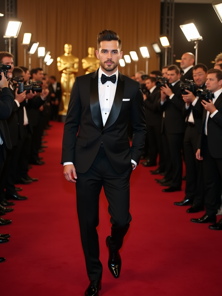 A stunning celebrity walking down the red carpet at the Oscars, posing confidently under the bright flashes of cameras. The model is wearing a fitted black tuxedo with a sleek bow tie. The backdrop features Oscar statuettes and a crowd of photographers capturing the glamorous moment.