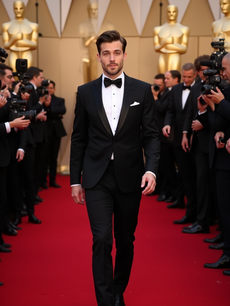 A stunning celebrity walking down the red carpet at the Oscars, posing confidently under the bright flashes of cameras. The model is wearing a fitted black tuxedo with a sleek bow tie. The backdrop features Oscar statuettes and a crowd of photographers capturing the glamorous moment.