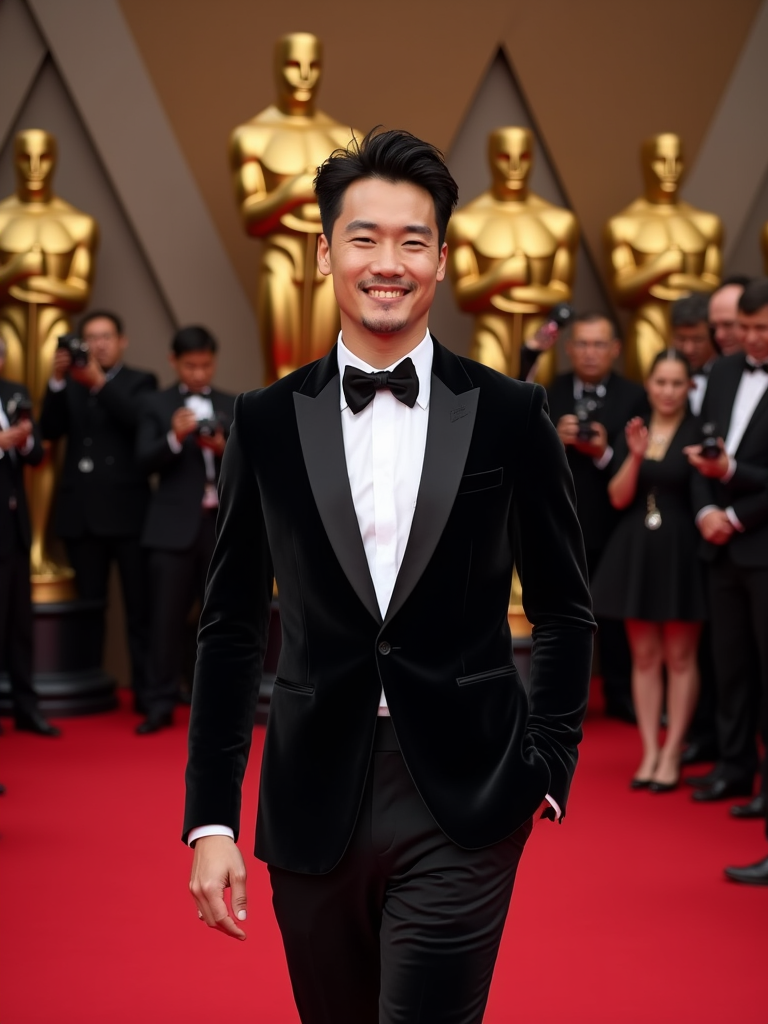 A stunning celebrity walking down the red carpet at the Oscars, posing confidently under the bright flashes of cameras. The model is wearing a fitted black tuxedo with a sleek bow tie. The backdrop features Oscar statuettes and a crowd of photographers capturing the glamorous moment.