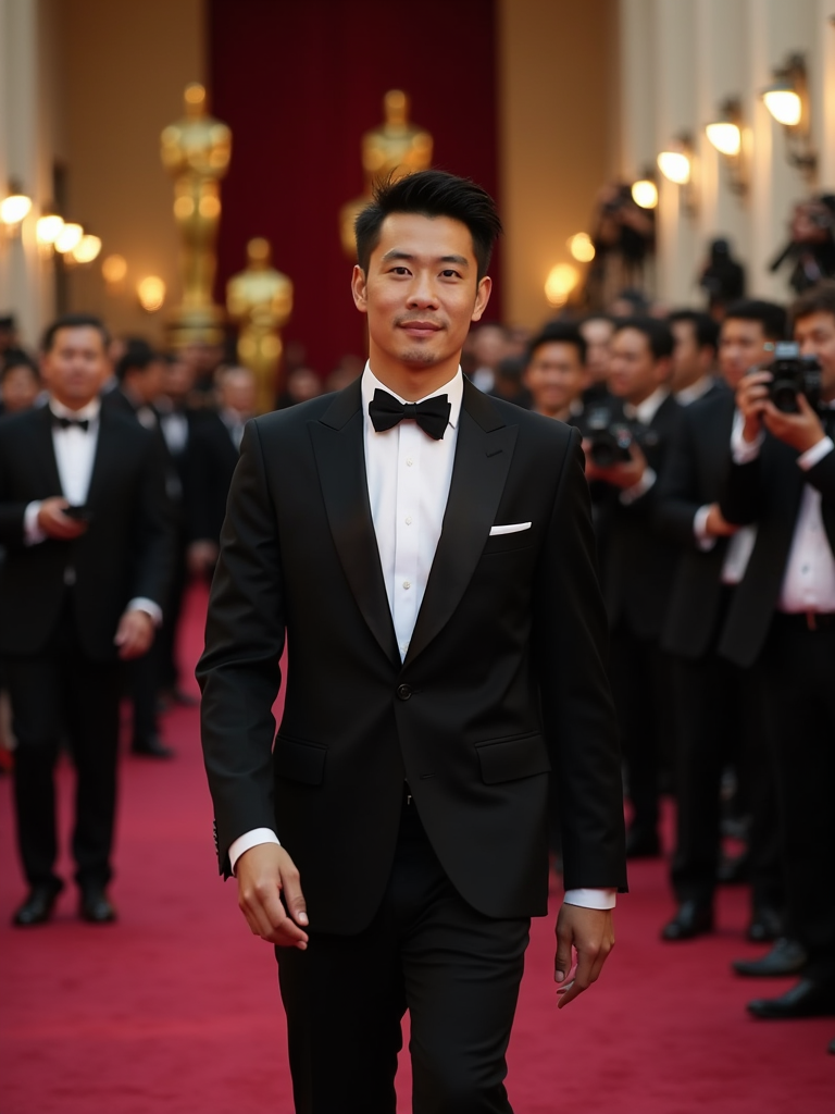 A stunning celebrity walking down the red carpet at the Oscars, posing confidently under the bright flashes of cameras. The model is wearing a fitted black tuxedo with a sleek bow tie. The backdrop features Oscar statuettes and a crowd of photographers capturing the glamorous moment.