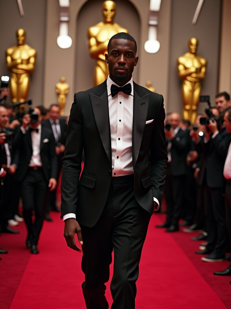 A stunning celebrity walking down the red carpet at the Oscars, posing confidently under the bright flashes of cameras. The model is wearing a fitted black tuxedo with a sleek bow tie. The backdrop features Oscar statuettes and a crowd of photographers capturing the glamorous moment.