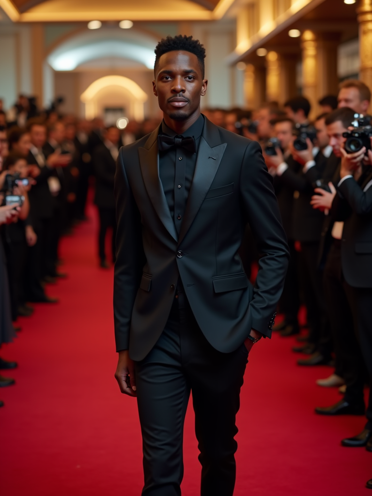 A stunning celebrity walking down the red carpet at the Oscars, posing confidently under the bright flashes of cameras. The model is wearing a fitted black tuxedo with a sleek bow tie. The backdrop features Oscar statuettes and a crowd of photographers capturing the glamorous moment.