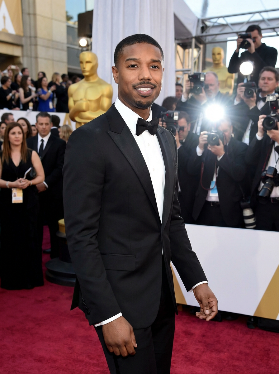 A stunning celebrity walking down the red carpet at the Oscars, posing confidently under the bright flashes of cameras. The model is wearing a fitted black tuxedo with a sleek bow tie. The backdrop features Oscar statuettes and a crowd of photographers capturing the glamorous moment.