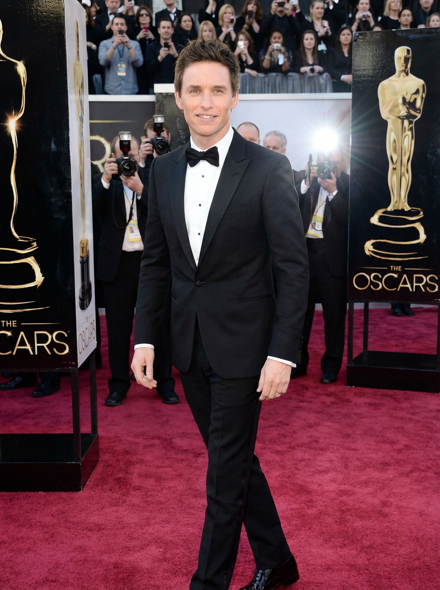 A stunning celebrity walking down the red carpet at the Oscars, posing confidently under the bright flashes of cameras. The model is wearing a fitted black tuxedo with a sleek bow tie. The backdrop features Oscar statuettes and a crowd of photographers capturing the glamorous moment.