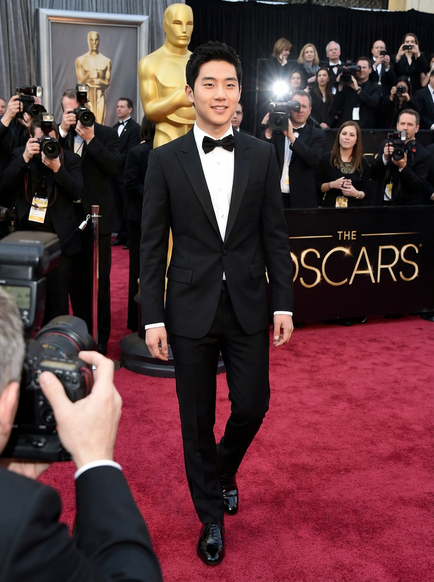 A stunning celebrity walking down the red carpet at the Oscars, posing confidently under the bright flashes of cameras. The model is wearing a fitted black tuxedo with a sleek bow tie. The backdrop features Oscar statuettes and a crowd of photographers capturing the glamorous moment.