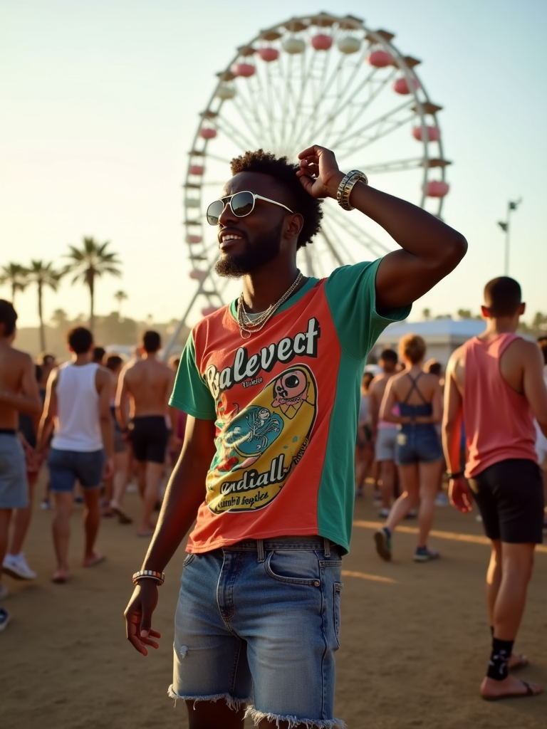 a stunning model at Coachella music festival, dancing and enjoying the music in a vibrant crowd, wearing a colorful graphic t-shirt and denim shorts, with the iconic Coachella ferris wheel in the background