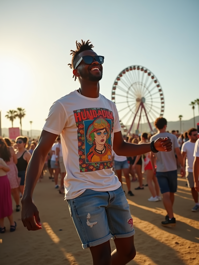 a stunning model at Coachella music festival, dancing and enjoying the music in a vibrant crowd, wearing a colorful graphic t-shirt and denim shorts, with the iconic Coachella ferris wheel in the background