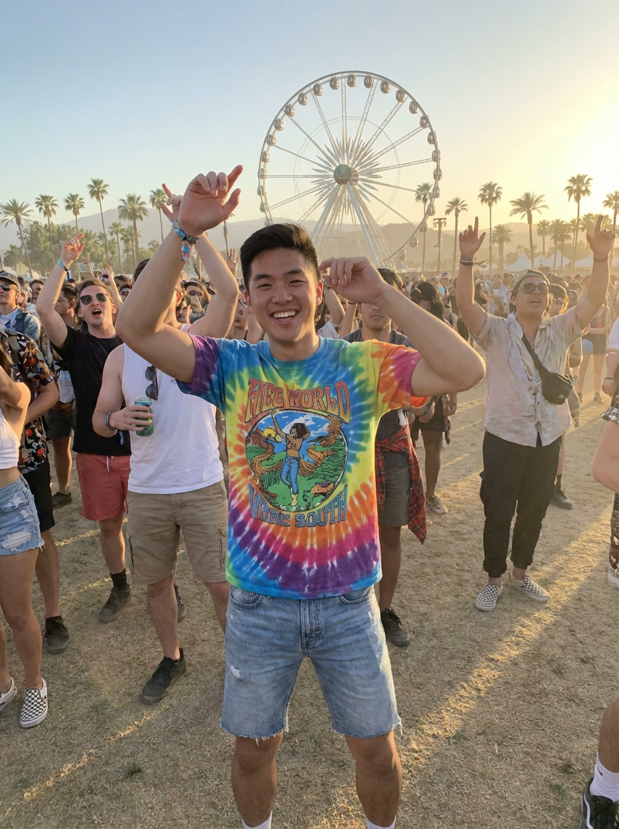 a stunning model at Coachella music festival, dancing and enjoying the music in a vibrant crowd, wearing a colorful graphic t-shirt and denim shorts, with the iconic Coachella ferris wheel in the background