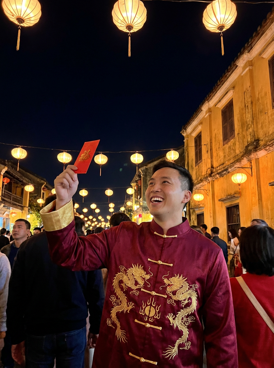 a stunning model celebrating Chinese New Year, sky full of traditional floating lanterns, wearing a traditional Tang suit in auspicious colors