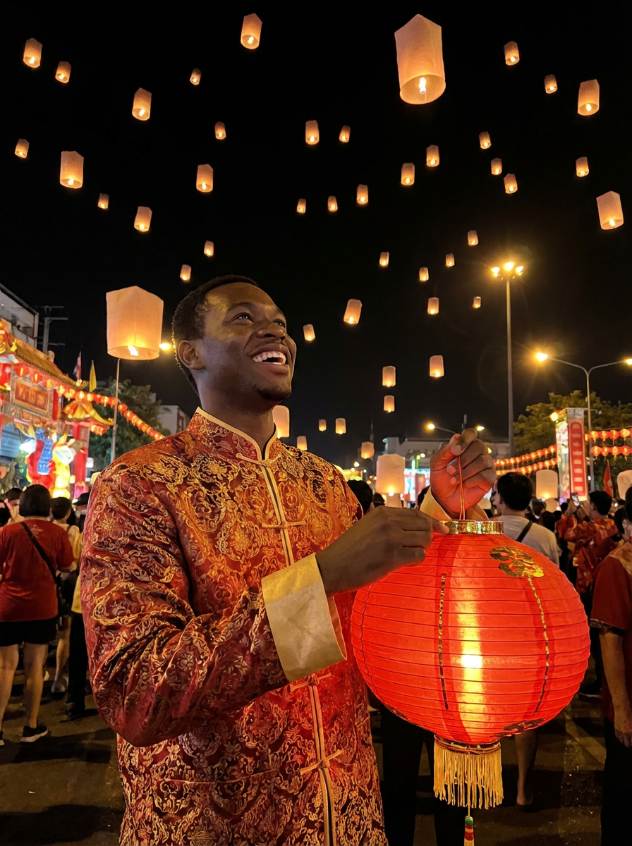 a stunning model celebrating Chinese New Year, sky full of traditional floating lanterns, wearing a traditional Tang suit in auspicious colors