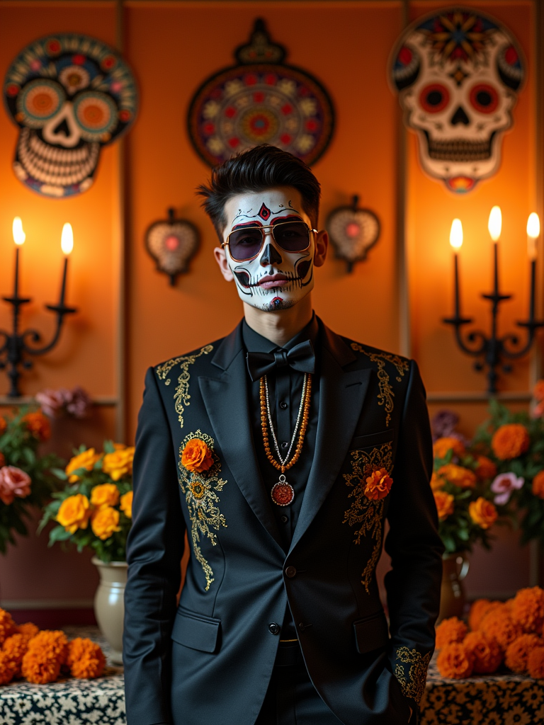 a stunning model celebrating Day of the Dead, surrounded by marigold flowers and candles, wearing a formal suit with traditional elements, with sugar skull decorations and papel picado in the background