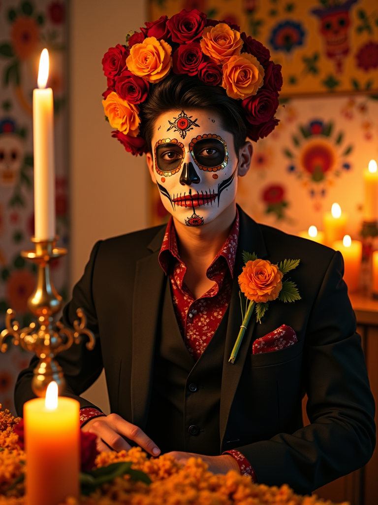 a stunning model celebrating Day of the Dead, surrounded by marigold flowers and candles, wearing a formal suit with traditional elements, with sugar skull decorations and papel picado in the background
