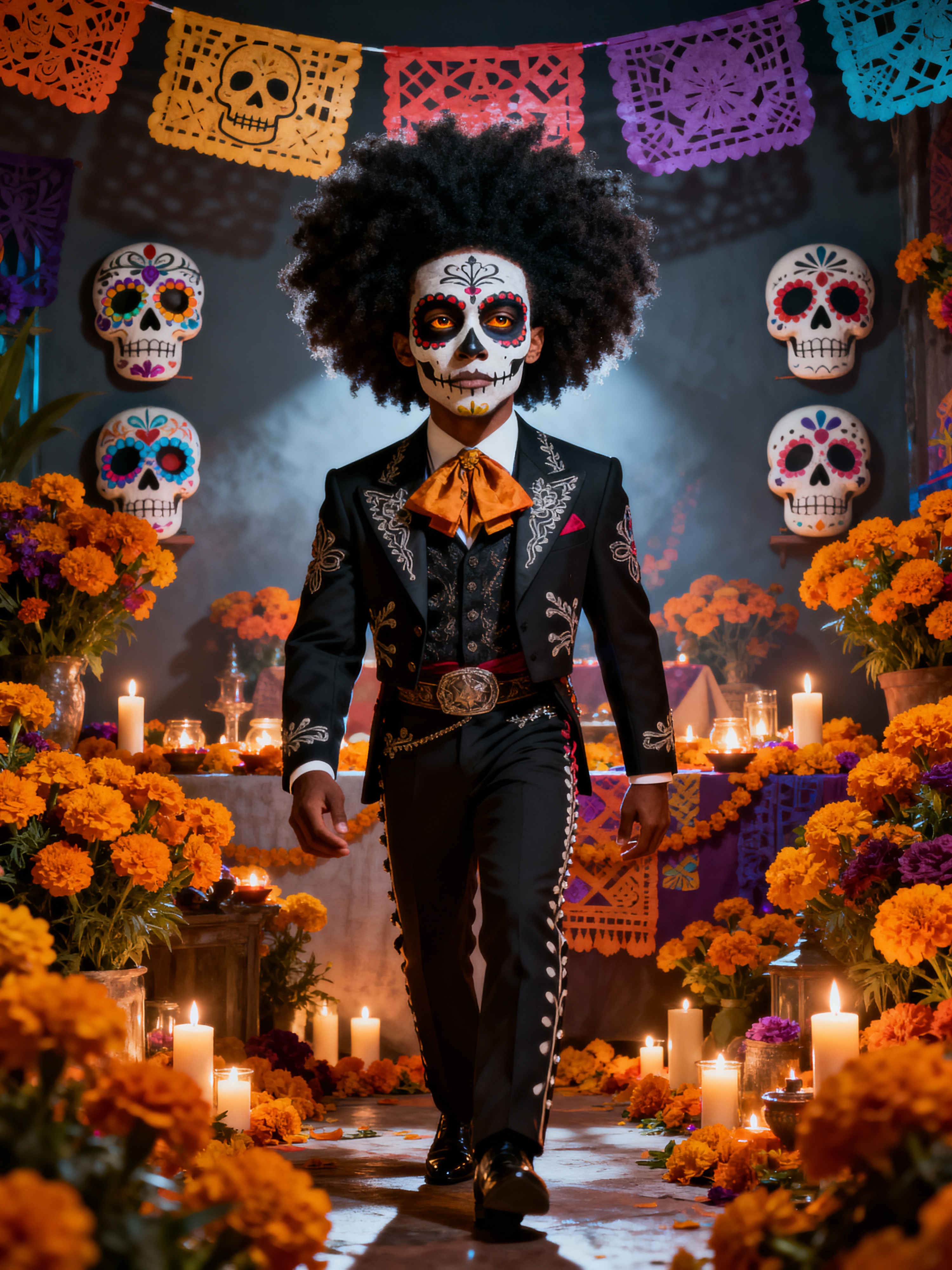 a stunning model celebrating Day of the Dead, surrounded by marigold flowers and candles, wearing a formal suit with traditional elements, with sugar skull decorations and papel picado in the background