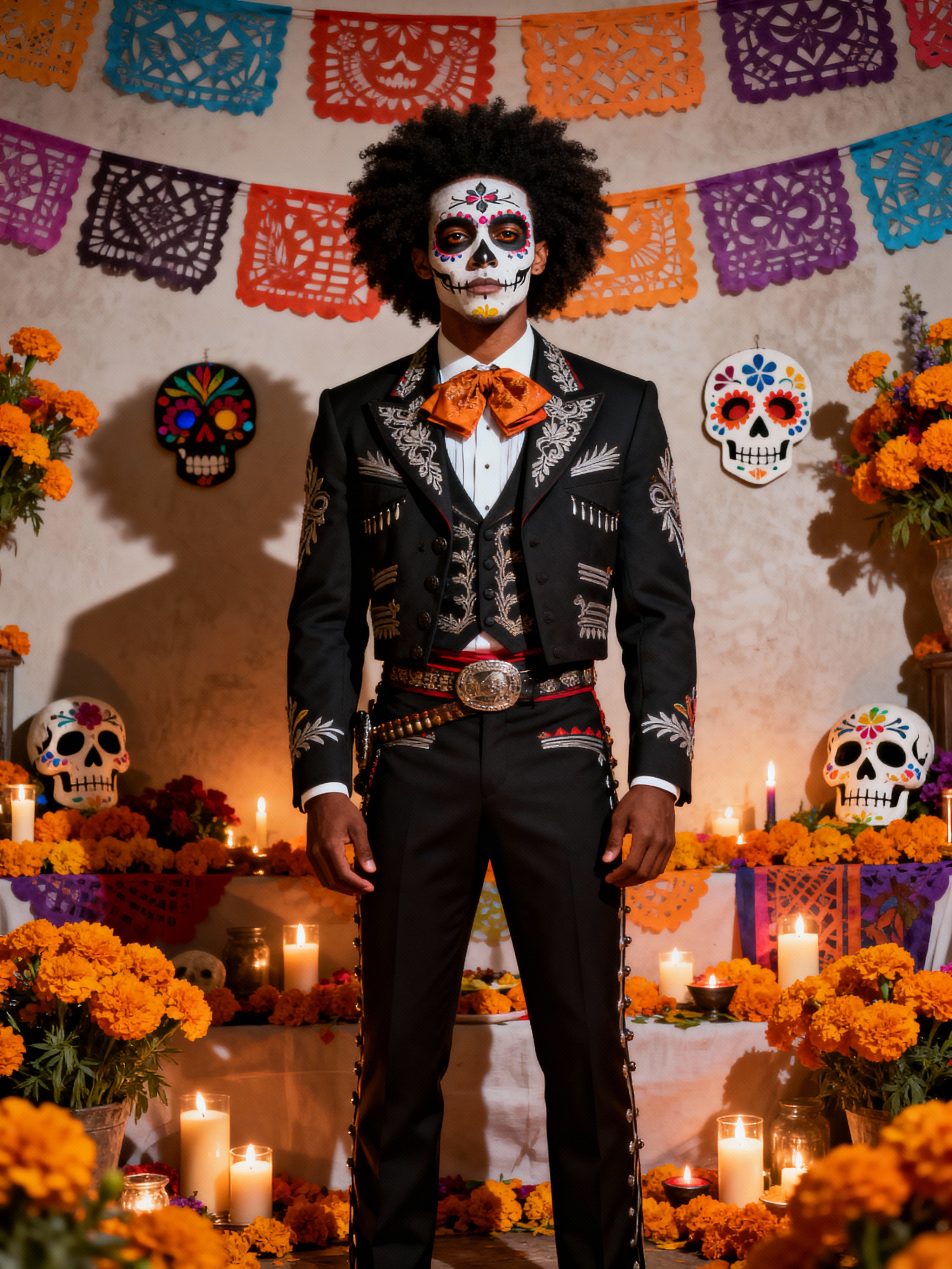 a stunning model celebrating Day of the Dead, surrounded by marigold flowers and candles, wearing a formal suit with traditional elements, with sugar skull decorations and papel picado in the background