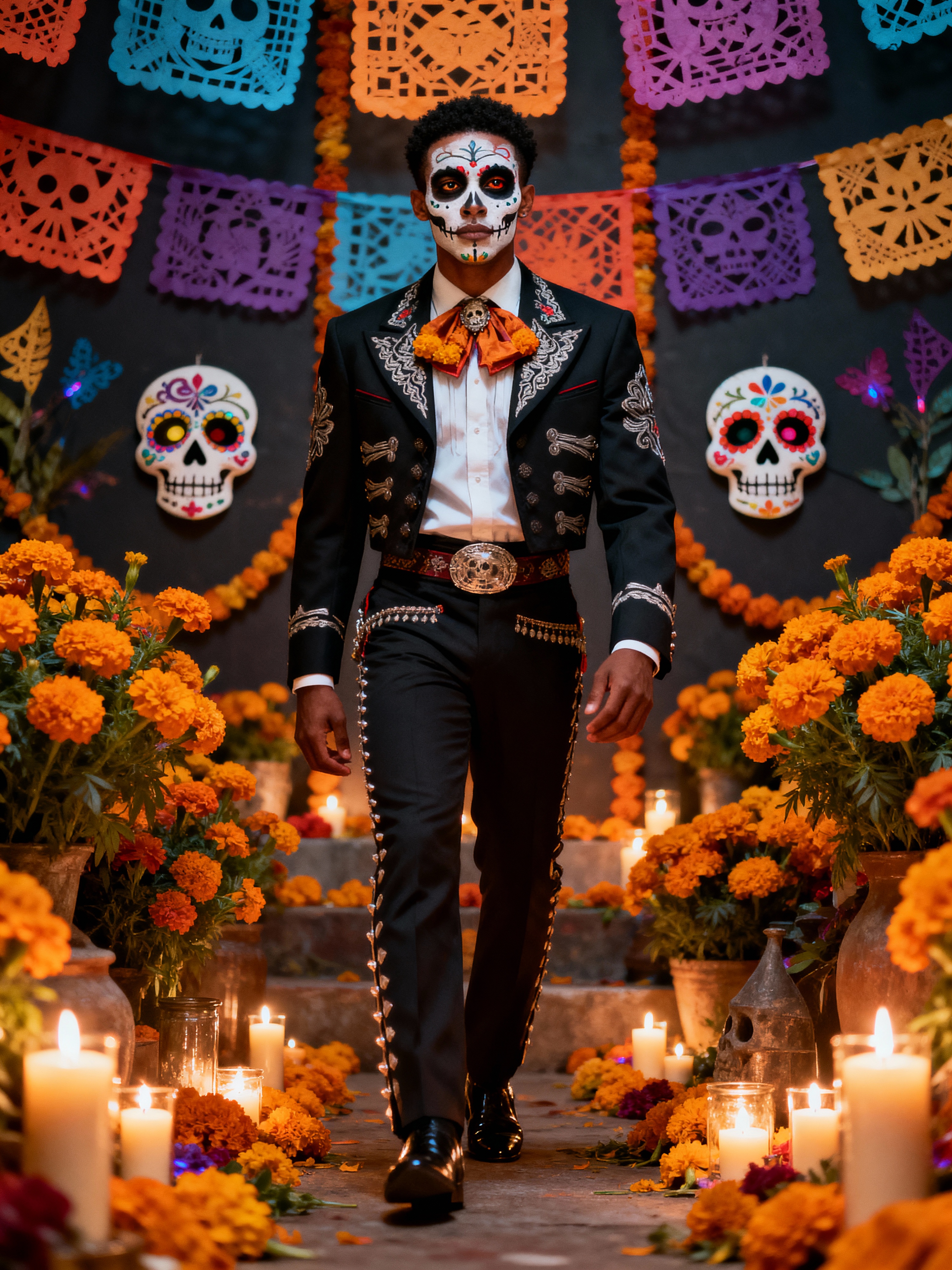 a stunning model celebrating Day of the Dead, surrounded by marigold flowers and candles, wearing a formal suit with traditional elements, with sugar skull decorations and papel picado in the background