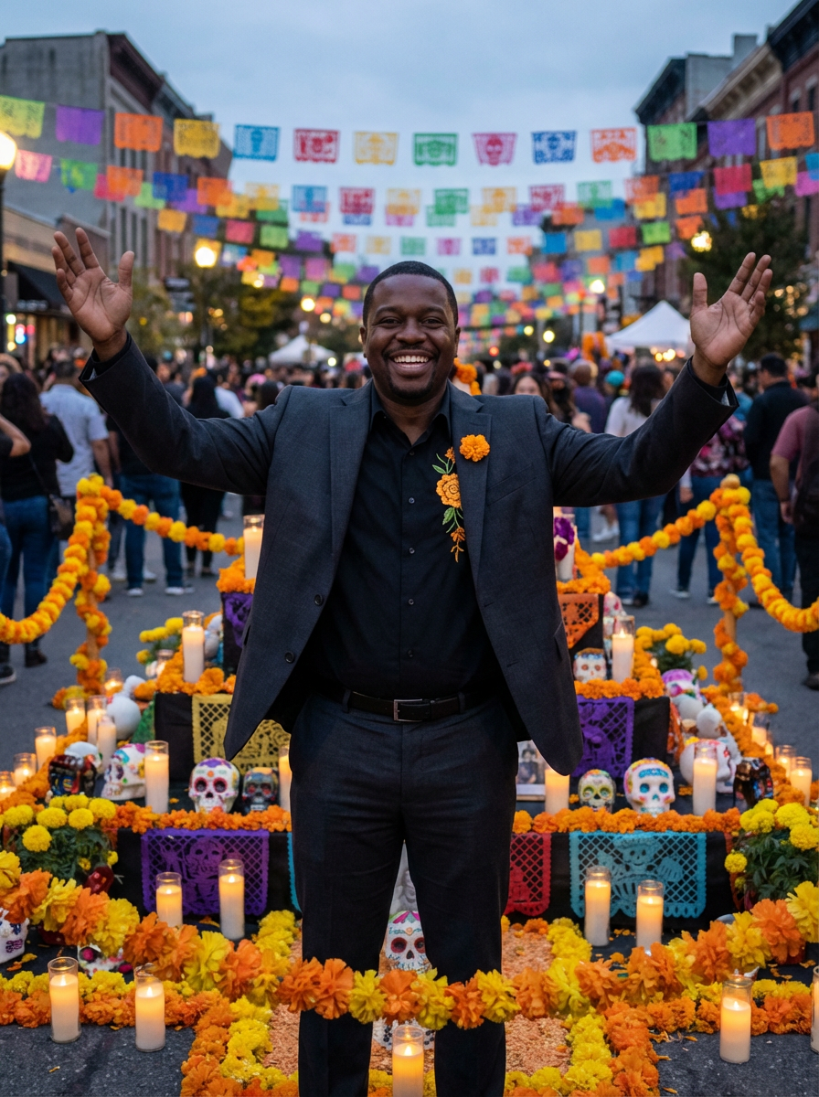 a stunning model celebrating Day of the Dead, surrounded by marigold flowers and candles, wearing a formal suit with traditional elements, with sugar skull decorations and papel picado in the background