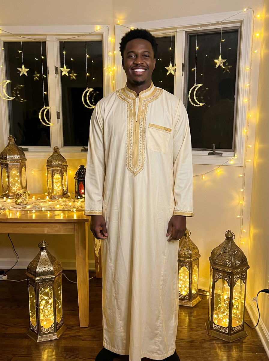 a stunning model celebrating Eid, surrounded by traditional lanterns and fairy lights, wearing a traditional thobe or kurta, with crescent moon decorations in the background