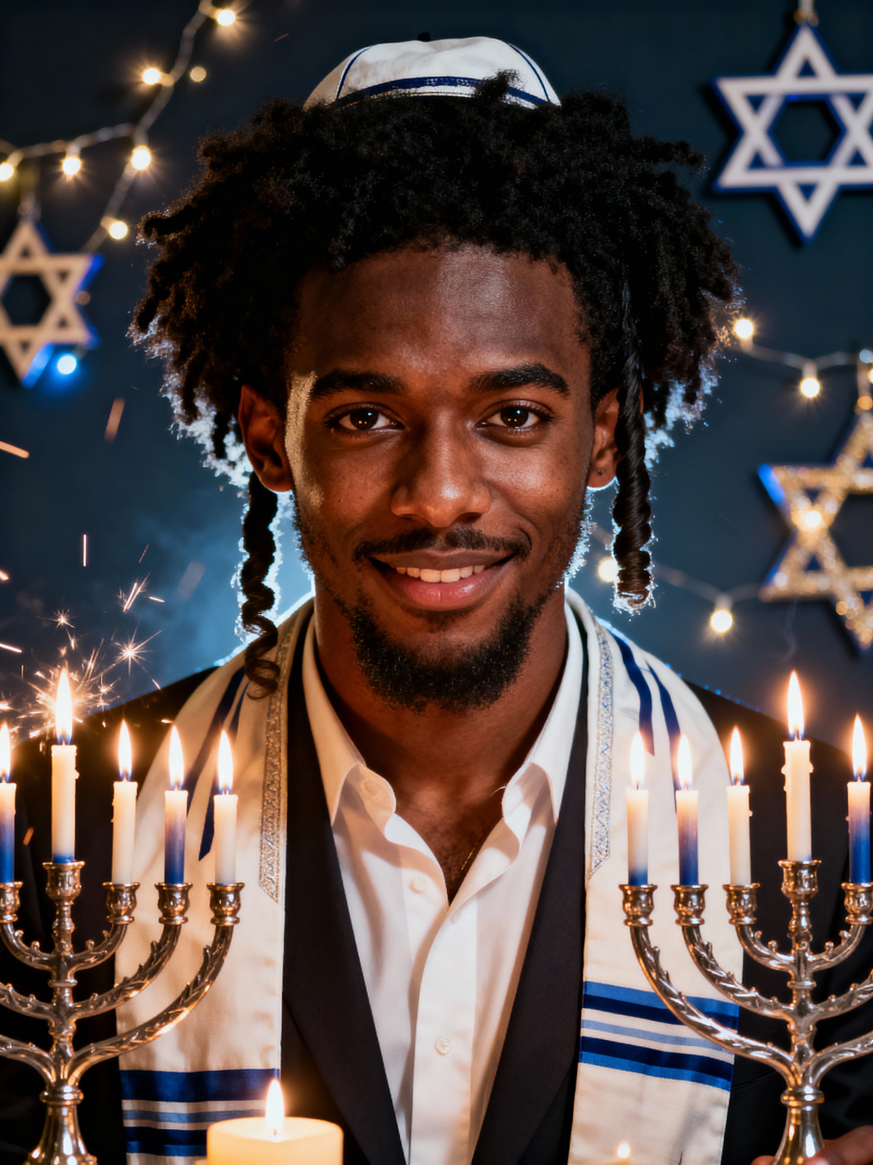 a stunning model celebrating Hanukkah, surrounded by lit menorahs and twinkling lights, wearing a traditional festive attire, with Star of David decorations in the background