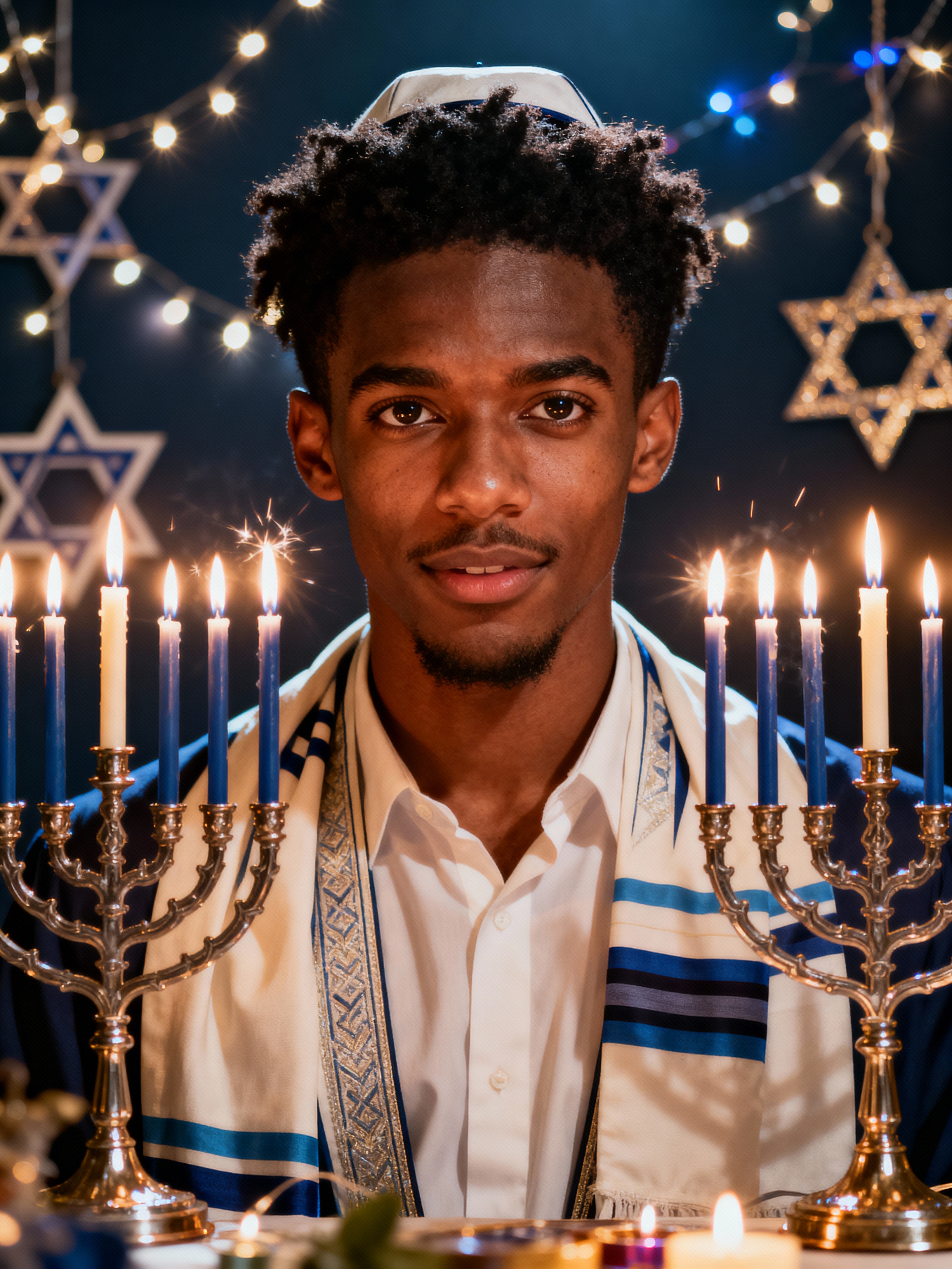a stunning model celebrating Hanukkah, surrounded by lit menorahs and twinkling lights, wearing a traditional festive attire, with Star of David decorations in the background