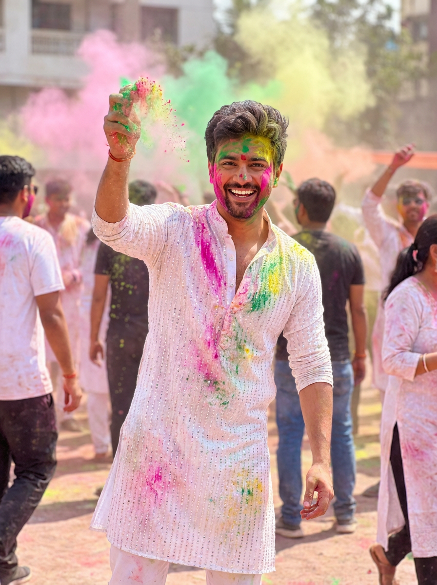 a stunning model celebrating Holi festival, covered in vibrant colored powders, wearing a white traditional kurta, joyfully throwing colorful powder in the air against a festive background