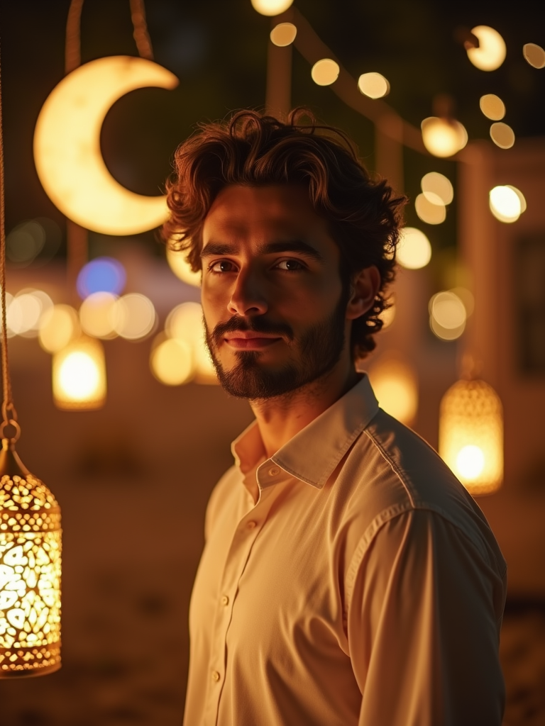 a stunning model celebrating Ramadan, surrounded by traditional lanterns and fairy lights, wearing a traditional thobe or kurta, with crescent moon decorations in the background