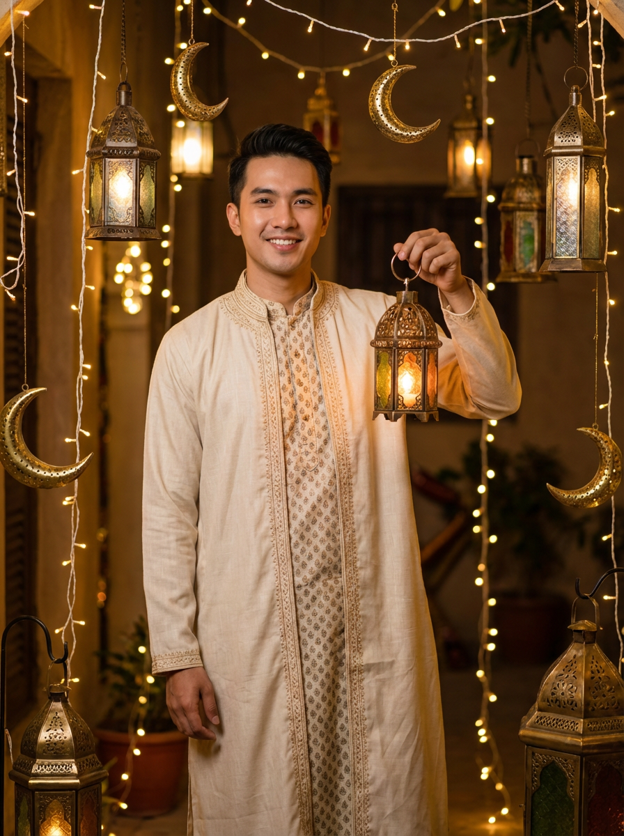 a stunning model celebrating Ramadan, surrounded by traditional lanterns and fairy lights, wearing a traditional thobe or kurta, with crescent moon decorations in the background
